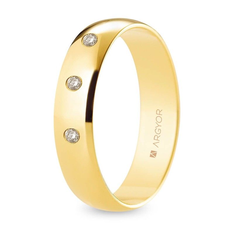 Aliança Argyor-MRM de ouro 18k 5,00 mm (18)A50RP3D acabamento polido 3 diamantes 0,06 ct H-SI. Aliança feita em ouro 18k 750/000 (18k). Tamanhos 07 a 33. Acabamento polido. Design 3 diamantes 0,06 ct H-SI. Medidas 5,00mm. Certificado de autenticidade e garantia de qualidade dos materiais de fabricação. Ref. (18)A50RP3D