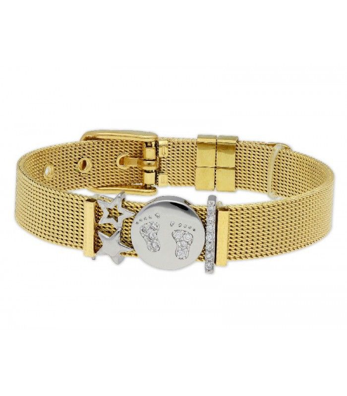 Pulseira feminina Liska LMBR44BD-B em aço dourado com estrelas e pés. Pulseira feita de aço inoxidável banhado a ouro. Design de tira de aço com estrelas, pés e tira com zircônias. Coleção MOMENTOS. Certificado de autenticidade e garantia de qualidade dos materiais de fabricação. Ref. LMBR44BD-B
