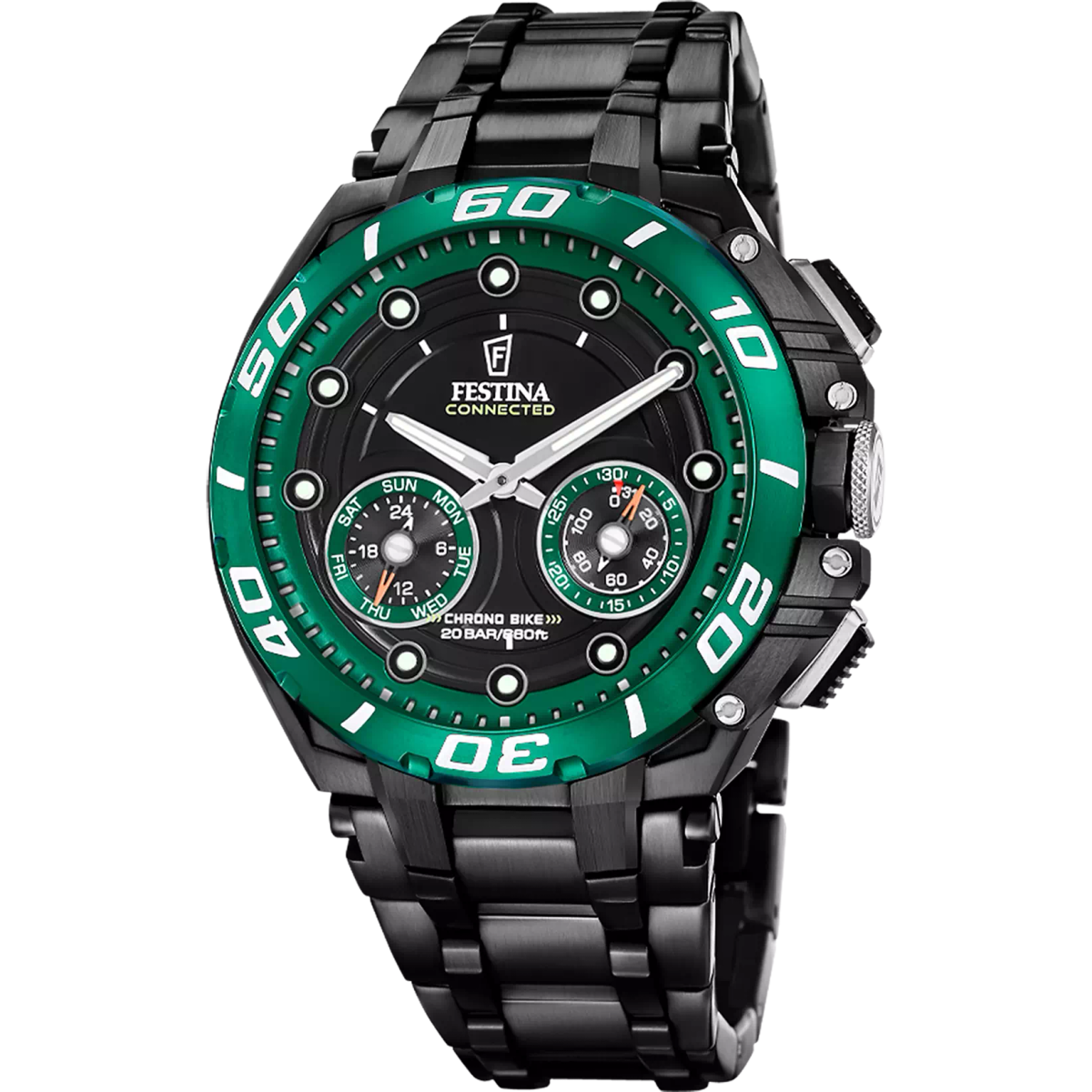 Reloj Festina Hombre F20762/2 Connected Acero Negro Analógico. Caja de acero negro de 46mm de diámetro. Bisel verde. Brazalete de acero negro. Cierre desplegable. Esfera negra. Multifunción, calendario y subesferas con fecha y días. Cristal zafiro. Movimiento quartz. Sumergible 200m.. 3 años de garantía. Ref F20762/2