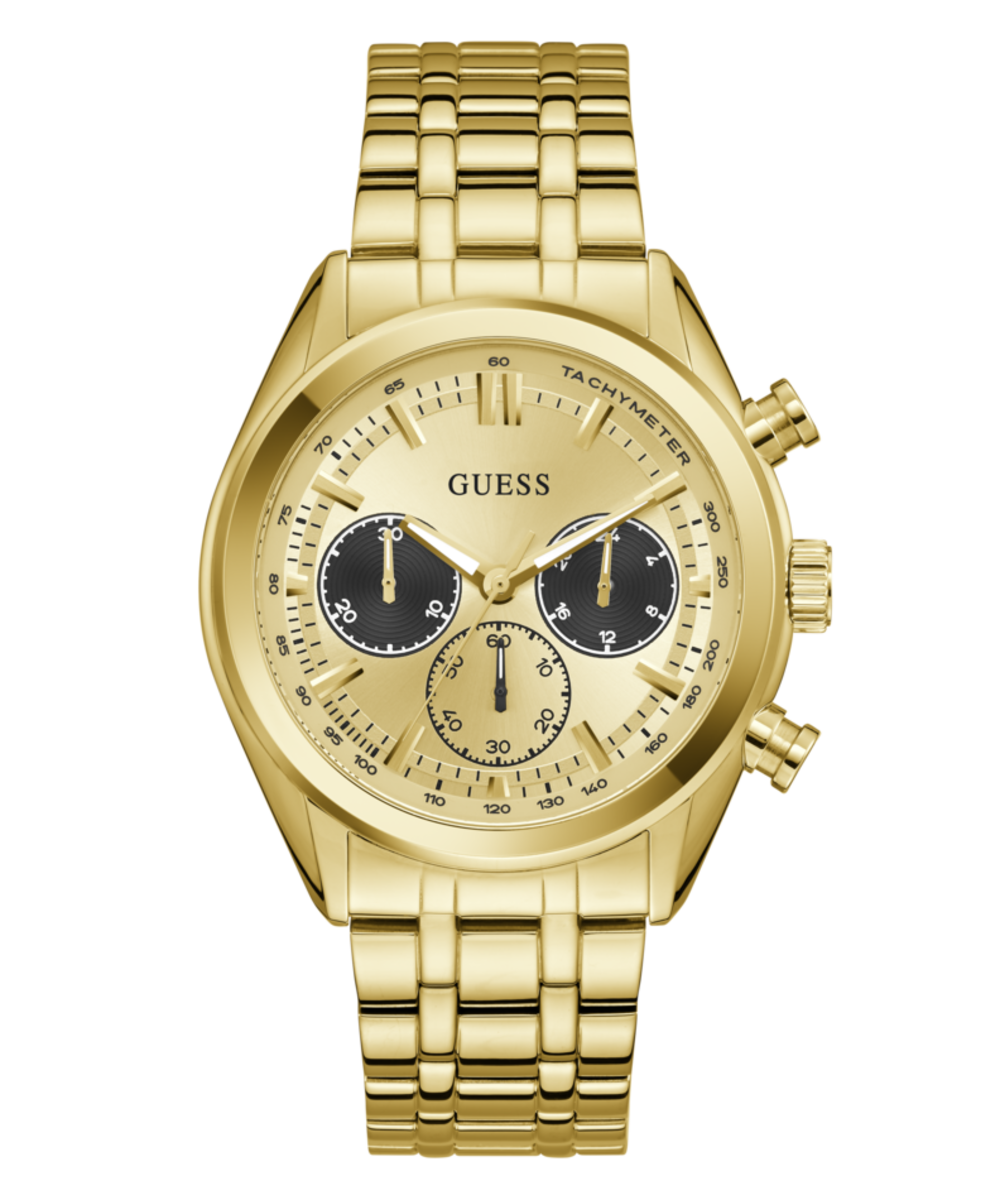 Reloj Guess Hombre GW0971G2 Dawson Acero Dorado Cronógrafo Analógico. Caja de acero dorado de 44mm de diámetro. Bisel dorado. Brazalete de acero dorado. Cierre desplegable. Esfera dorada. Multifunción, cronógrafo. Cristal mineral. Movimiento quartz. Sumergible 50m. 3 años de garantía. Ref GW0971G2