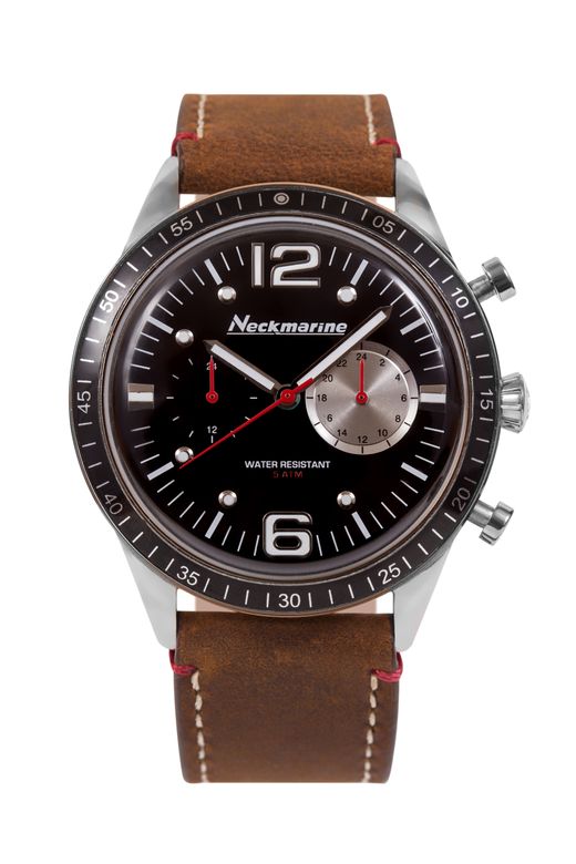 Reloj Neckmarine Infantil NKM945L06 Marrón Acero Analógico. Caja de acero de 38mm de diámetro. Bisel negro. Correa de caucho marrón. Cierre hebilla. Esfera negra. Multifunción, doble uso horario, cronógrafo. Cristal mineral. Movimiento VD32. Sumergible 50m. Peso 45g. 3 años de garantía. Ref NKM945L06
